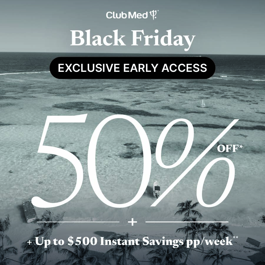 50% off*: Discount applies to the standard rate, based on double occupancy and available on select dates at the following resorts: Miches Playa Esmeralda, Dominican Republic; Punta Cana, Dominican Republic; Club Med Cancun, Mexico; La Caravelle, Guadeloupe; Buccaneer’s Creek, Martinique; Turkoise, Turks & Caicos; Columbus Isle, Bahamas; and Québec Charlevoix, Canada. Discounts on other dates, room categories, or at other resorts may vary. Blackout dates apply, including holidays and other specific dates. Offer requires a minimum stay of 1 night (7 nights for Columbus Isle). Valid for new individual bookings made through our call center exclusively for our Great Members with Turquoise, Silver, Gold, and Platinum status, for select travel dates with check-in from December 6, 2025, and check-out on or before June 19, 2026. Book by November 17, 2025. Offer is subject to capacity control and may increase or be withdrawn at any time.