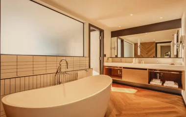 The perfect solution for high-end family holidays. Parents and children can enjoy separate spaces - both have their own bedroom and bathroom*. The living room is a cosy space where everyone can get together.