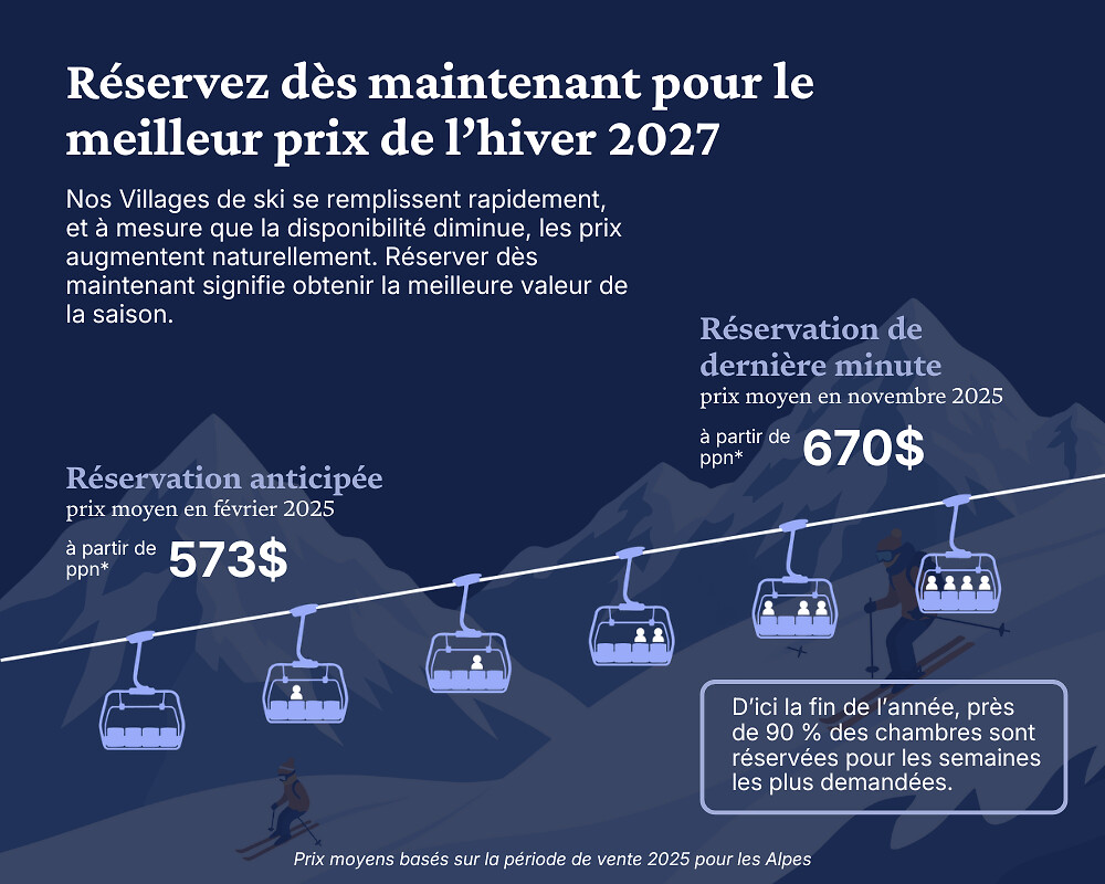 *Exemple de prix basé sur un séjour hivernal dans les Alpes en février 2025 (hiver 2026). Le tarif indiqué est par personne et par nuit, pour un séjour de 7 nuits pour 2 adultes. Ce prix est fourni à titre indicatif seulement ; les tarifs et les disponibilités pour l’hiver 2027 peuvent varier au moment de la réservation.