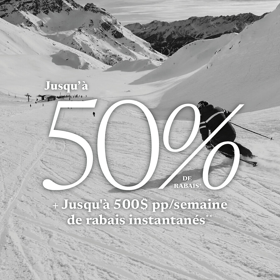 *Jusqu'à 990$ de rabais instantané : Obtenez un rabais allant jusqu'à 990$ par adulte, basé sur un séjour de 7 nuits en occupation double dans une chambre Deluxe ou une Suite pour des dates spécifiques dans certains Villages Club Med Ski dans les Alpes. Les crédits pour d'autres dates, durée de séjour et catégories de chambres peuvent varier. L’offre requiert un séjour minimum de 3 à 7 nuits en fonction du village et des dates de voyage réservées. Offre valide pour des nouvelles réservations individuelles seulement, pour certaines dates de voyages jusqu'au avril 2026, jusqu'à nouvel ordre. Doit être réservé jusqu'au 1er décembre 2025.