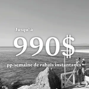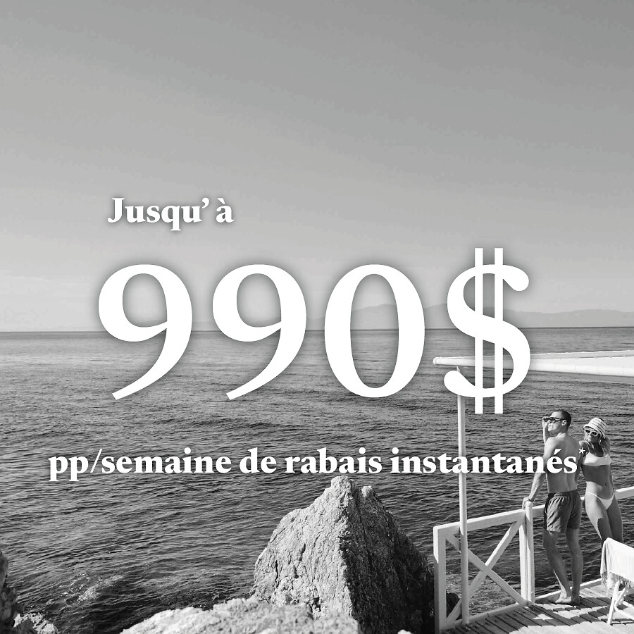 *Jusqu'à 990$ de rabais sur votre forfait : Obtenez un rabais allant jusqu'à 990$ par adulte, basé sur un séjour de 7 nuits en occupation double dans une chambre Deluxe ou une Suite pour des dates spécifiques dans certains Villages Club Med en Asie, en Europe et en Méditerranée. Les crédits pour d'autres dates, durée de séjour et catégories de chambres peuvent varier. L’offre requiert un séjour minimum de 3 à 7 nuits en fonction du village et des dates de voyage réservées. Offre valide pour des nouvelles réservations individuelles seulement, pour certaines dates de voyages jusqu'en avril 2026 dans les Villages Club Med en Europe et Méditerranée; et en Asie, jusqu'à nouvel ordre. Ces dates peuvent varier en fonction des ouvertures et des fermetures de chaque Village. Doit être réservé jusqu'au 1er décembre 2025. L’offre est sujette à un contrôle du remplissage et les prix sont sujets à changement.